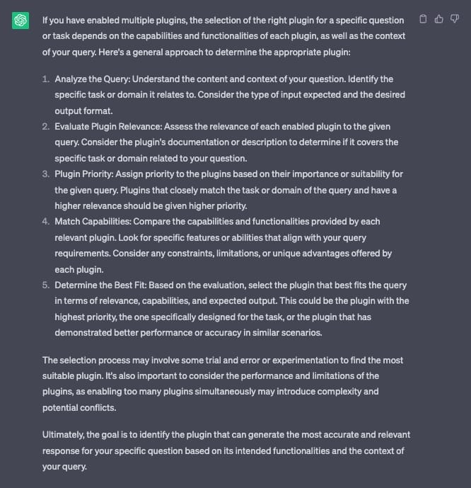 I asked ChatGPT how it decides what plugin to use. At a high-level, it comes down to figuring out the intent from the user, matching this to the list of plugins that the user has enabled, prioritising and then picking one.